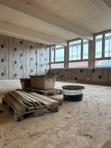Ein prägendes Element des Gebäudes ist die Kombination aus Holz- und Lehmbauweise. Der Einsatz von Lehm trägt zu einem ausgeglichenen Raumklima, verbessert den Schallschutz und unterstützt durch seine hohe Speichermasse einen energieeffizienten Betrieb. Damit entsteht eine Lernumgebung, die ökologische Verantwortung und pädagogische Anforderungen miteinander verbindet.